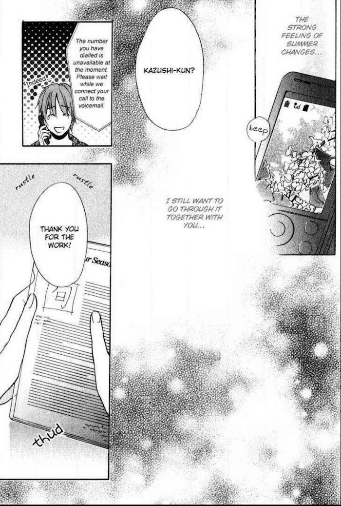 Kazushi, an elite, met Harutomo, a cleaner whose dream is to become a chef. Because Harutomo has always been treasuring the change in seasons, after falling in love with him, Kazushi started to treasure the changes too. He found his world started to fill with colors and he finally understood the happiness of "giving." Let Fujitani-sensei take you through the seasons with this very lovely story on how this couple work hard towards their future together and how they manage through their long-distance relationship when Kazushi was posted overseas. (Source: Attractive Fascinate)
