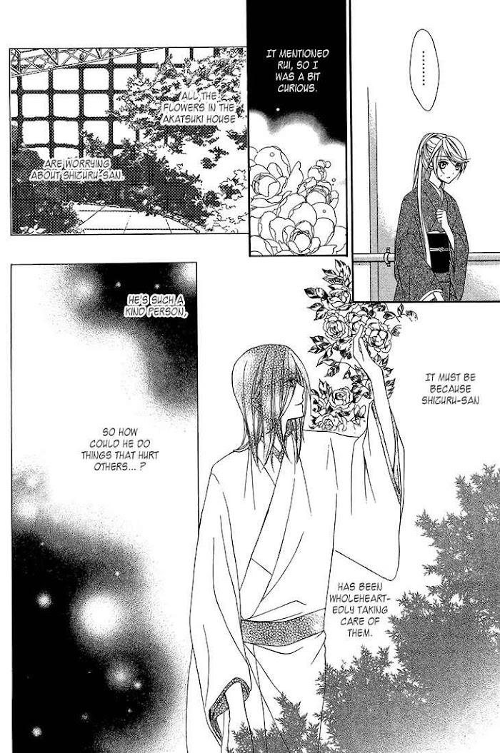 Riu Rokugiya, is the only daughter of a famous Kabuki theatre house.Since she was small, she had always dreamt the same weird dream about meeting a man under the red moon.She didn't know him until she attended one of the performances of her brothers. The man turns out to be one of the Akatsukiya's heir, Rui. The Akatsukiyas were distant relative of the Rokugiyas. Just recently, its Head, Ashikawa Enjuuro died. The family is on the process of choosing its successor among the three adopted sons, one of which is Rui. What relation will Rui have with Riu? Why was she dreaming of him dying every night? (Source: MU)