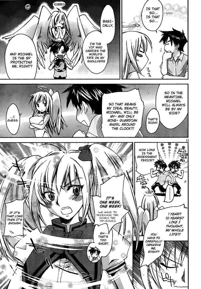 Main char gets visited by the angel Micheal in female form. She tells him that the Earth only got 7 days left and it's all up to him if the Earth got a chance to survive or not. Guy is huge pervert while the angel just want the world to go under. Follow their adventure to see if she manages to win by letting the guy do whatever sins he wants to do. (Source: Shi-Ki)