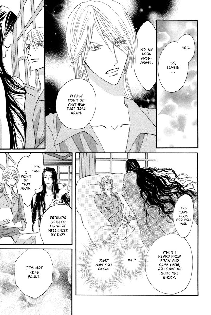 Frau and Kio are angels, and it's their duty to protect the passage of souls to Heaven. Their roles are reversed when Frau gets promoted, leaving Kio behind, and then suddenly appears to be Kio's protector. Can the two work out their new relationship while battling off the Manifus...? (Source: Storm in Heaven) Volume 1 starts off with chapter 0, originally a one-shot called "Eden".