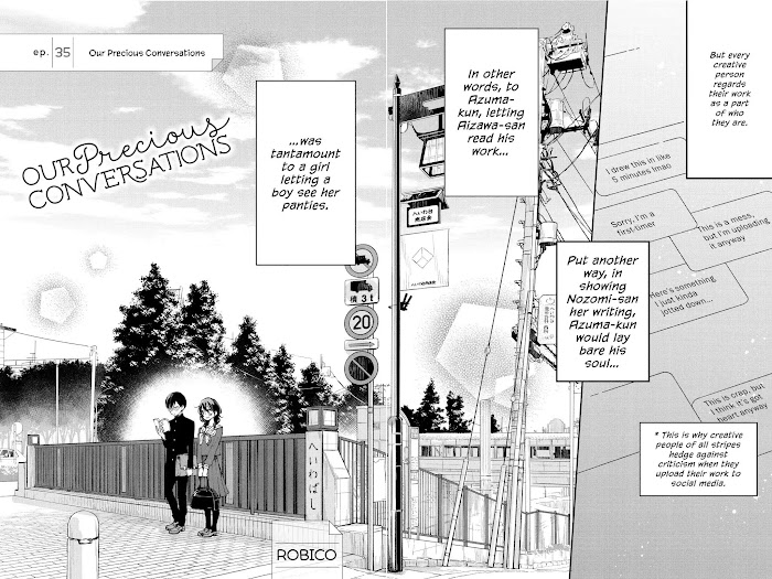 Nozomi Aizawa has kept her feelings for her schoolmate Azuma a secret for quite a while, but the time has come for her to finally confess. His response, though, is far from ordinary! Led in circles by his hilarious tangents, these two awkward teenagers find themselves growing ever closer while muddling through misunderstandings and off-topic rants. When the airheaded stalker Aizawa finally connects with the petulant know-it-all Azuma, the result is a romantic comedy worth talking about! (Source: Kodansha Comics USA)