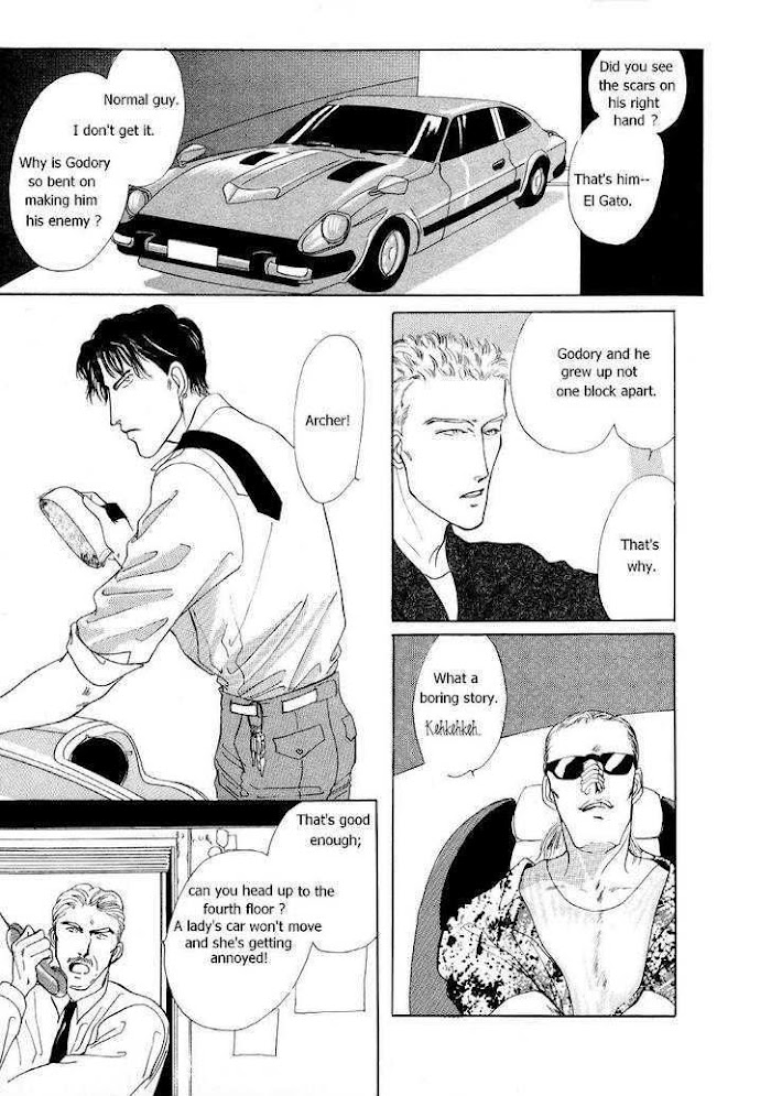 Charisma (ISHIHARA Satoru) manga summary: From Translated Treasures: It is a multi-perspective story following several different characters. The central character is Archer Rogue. Archer's entire family is a bit off-kilter. His father Ed is bi-polar due to physical abuse from his father as a child. As a result, he beats Archer at times ("for his own good"), or swings to a scared, child-like persona and is incapable of even feeding himself. Archer's childhood was understandably difficult, and he's a rather closed-off, violent person as a result. His older half-brother Murphy is mentally retarded. The story follows Archer (street name: El Gato) as he works with Deano to infiltrate the drug cartel that has a long-standing grudge against his gang. Along the way he meets Ken, not knowing that he is also infiltrating the cartel (for the police). It contains lots of conflict between groups, inside of groups, and with seeming random strangers. The stories in the first volume are in published order, rather than chronological: the first manga begins with Archer being released from prison for shooting his father. Then it goes back to a young 15-year-old Archer and how it all started. Prequel to Inu no Ou