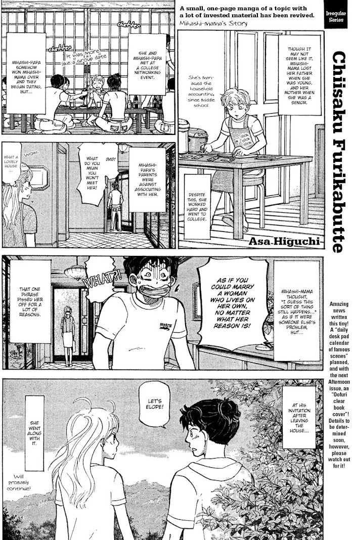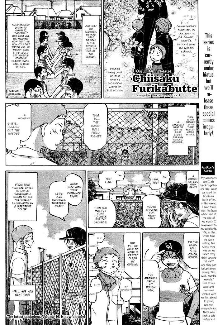 Chiisaku Furikabutte manga summary: Chiisaku Furikabutte, lit. “Small Windupâ€, was published in Afternoon between the tankobon publications of volumes 15 and 16 and during the 2011 hiatus, and it is a series of specials about the lives of Oofuri characters. (Nice Pitching!)