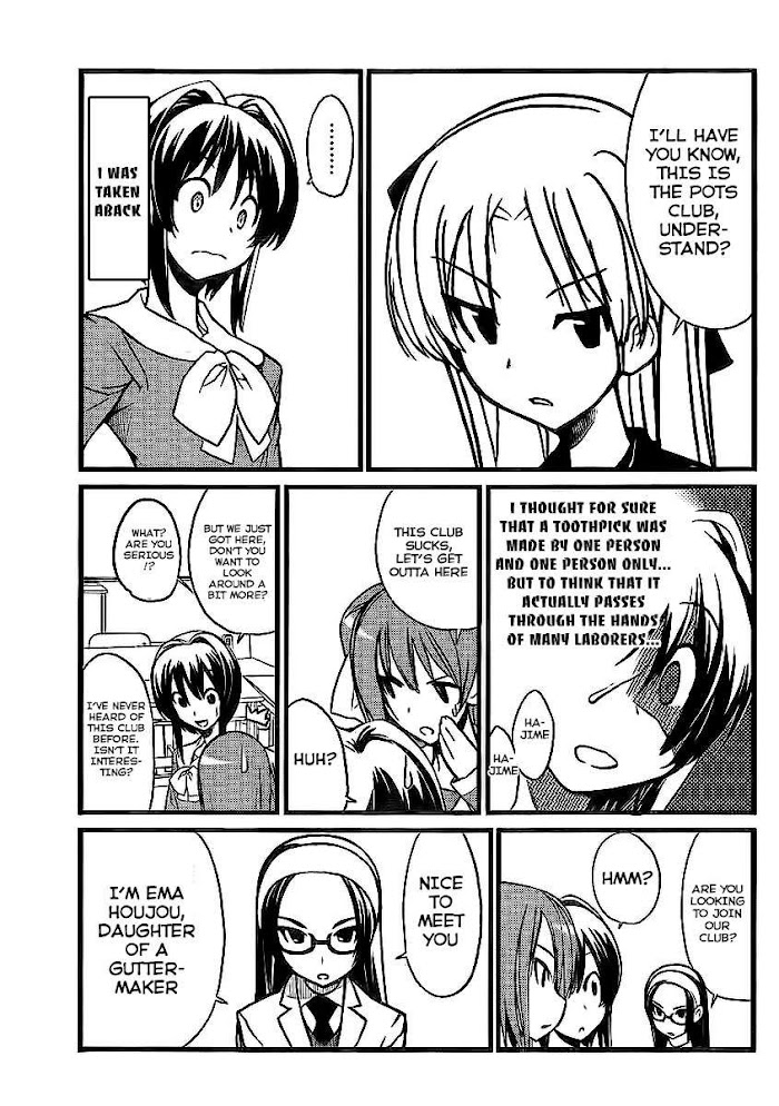 In a school where after school activities are mandatory among all students, Hajime and her friend Sayo come across a new club that they have never seen before. The club is called "The Cultural Activity Preservation Club." The two enter the room to find all kinds of analog jobs and activities, such as handcrafting mats and toothpicks. This is a unique cultural manga mixed with comedy so as not to bore you, this is Double-J! (Source: MangaHelpers)