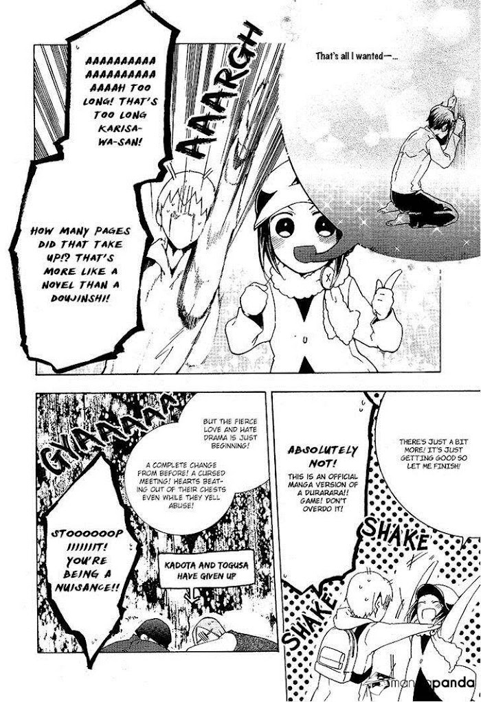 January, Ikebukuro. It's the same as usual; Mikado, Masaomi, and Anri have started their third term at Raira Academy, Simon is handing out flyers for Russia Sushi in the street, and Shizuo is throwing vending machines. At the movie theater on Sunshine 60 Dori, the New Year holiday movie "Bodyguard Case 2: Salaryman Ninja Guy," staring Hanejima Yuuhei and Hijiribe Ruri, is showing. Due to its popularity, more and more people have started to carry attaché cases similar to the one used in the movie. Meanwhile, Celty is busy running around answering requests for delivery of said attaché cases. And then a sandstorm "mist" starts to repeatedly envelope Ikebukuro, making it so that people cannot even see what's in front of them. It is in these sudden, localized "mists" that an opportunistic thief appears, targeting the attaché cases… (Source: MU)