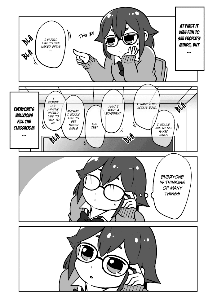ENMiyashita is a girl who has glasses with which she can see the thoughts of her classmates in the form of text balloons, thanks to these glasses she will discover that someone likes her. easy"ES-LAMiyashita es una chica que tiene unos lentes con los que puede ver los pensamientos de sus compañeros en forma de globos de texto, gracias a estos lentes descubrirá que alguien gusta de ella "Puedo ver la mente de las personas, pero en serio que no es fácil"