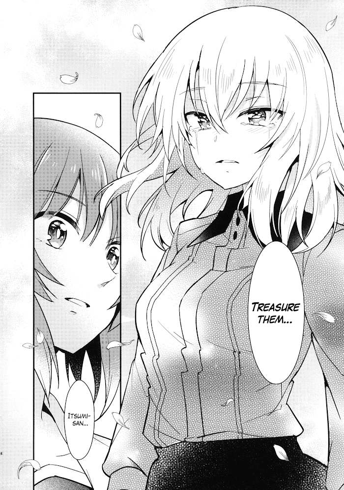 ENSpring will soon arrive, and Anglerfish Team will soon be third years at Oarai Girls' Academy. However, an unexpected guess drops in to find Nishizumi Miho and Shimada Arisu. Assuming those two leading figures of senshado would discuss its future, Itsumi Erika rushed to Oarai to find them. What she does find there, however, is not what she expected.