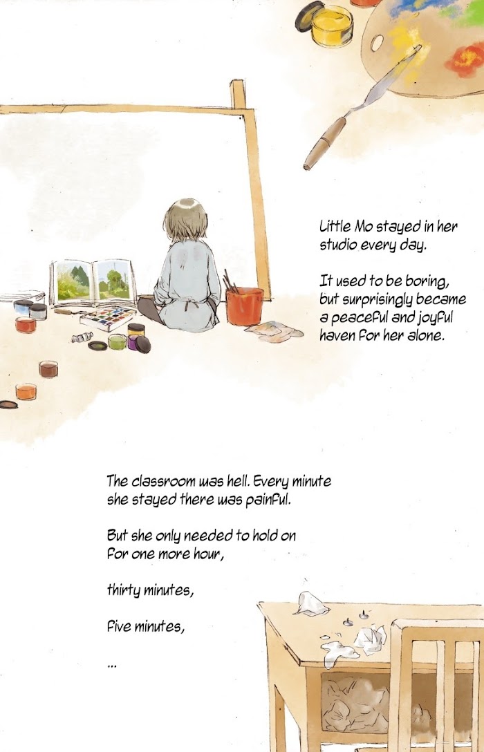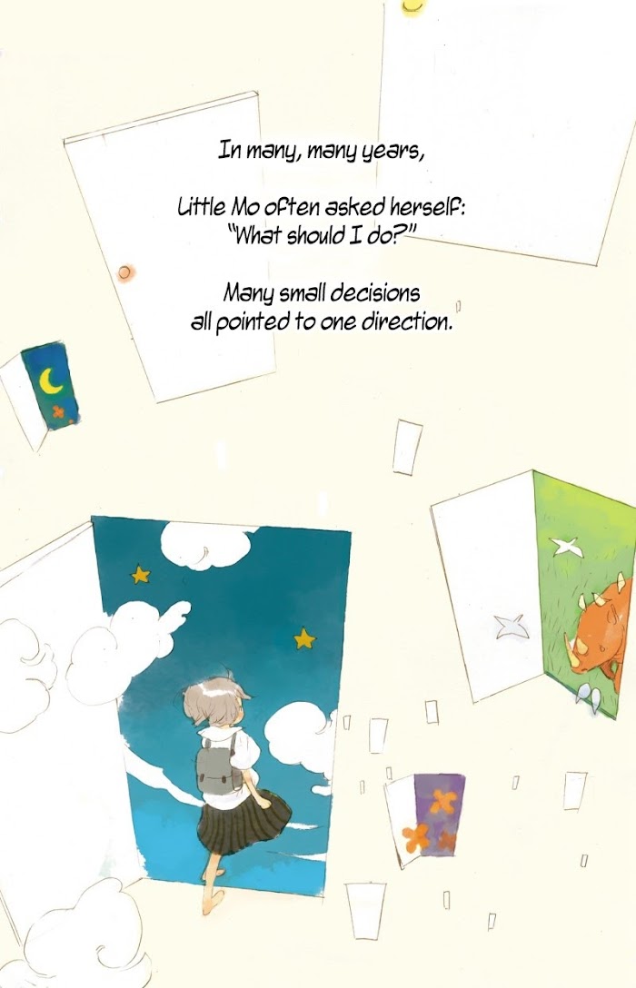 Fourteen-year-old Little Mo was bullied and called Godzilla by her classmates. Many years later, Mo realizes that life cannot be changed. What happens, happens. The things she had cared about when she was fourteen make herself look childish in her own eyes, and have become something to laugh at. The things that made her sad and hurt when she was fourteen still invoke a dull ache in her heart today. By reading the notebook of fourteen-year-old little Mo, the Mo of present-day begins to speak and console herself silently. This is a story about growing up and how children become adults.