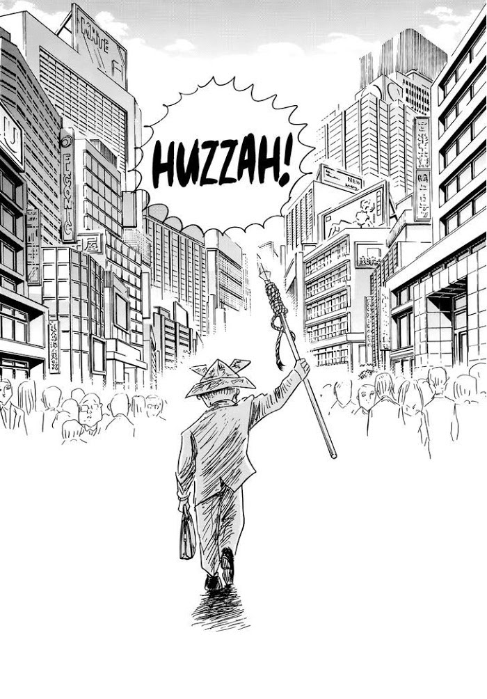 Inspired by Cervantes' Don Quixote, the author criticizes heartless individualism and indifference in modern Japan, as seen through the eyes of an old man, who, although childish with age, sees the truth of things.