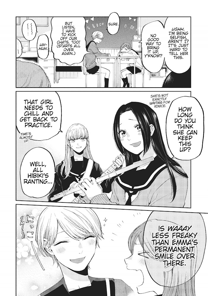 Asano Minato is hiding in plain sight. She's tall, but she's very quiet, and very withdrawn. She keeps her hair over her face and her head down. It's not hard to see that she's avoiding being seen. While eating lunch alone in her secret spot, she hears what is obviously an instrument. She immediately wonders why, since this high school doesn't have a band. She knows that…because that's why she transferred here.