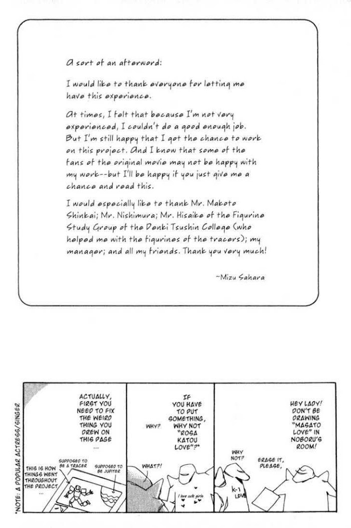 To what distance would you go for your one true love? In the midst of an alien invasion, Mikako joins the resistance, leaving behind the one young man she loves. As she goes deeper into space, Mikako's only connection with her boyfriend is through cell-phone text messages. The war rages on and years pass, but Mikako barely ages in the timelessness of space while Noboru grows old. How can the love of two people, torn apart by war, survive? (Source: Tokyopop)