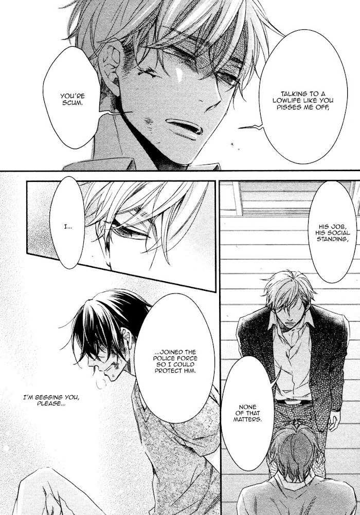 Narasaki Naoto was born into a family of thieves. After committing a marriage scam, he is arrested and taken to the upscale apartment of elite detective, Oogaki Kaoru. "I became a detective in order to distort that pretty face of yours." As the good-looking Kaoru with a stalker tendency calmly says that, Naoto slowly warms up to him as their peculiar living arrangement starts. A love story of captivity between a forceful detective x con artist. (Source: Fujoshi Bitches)