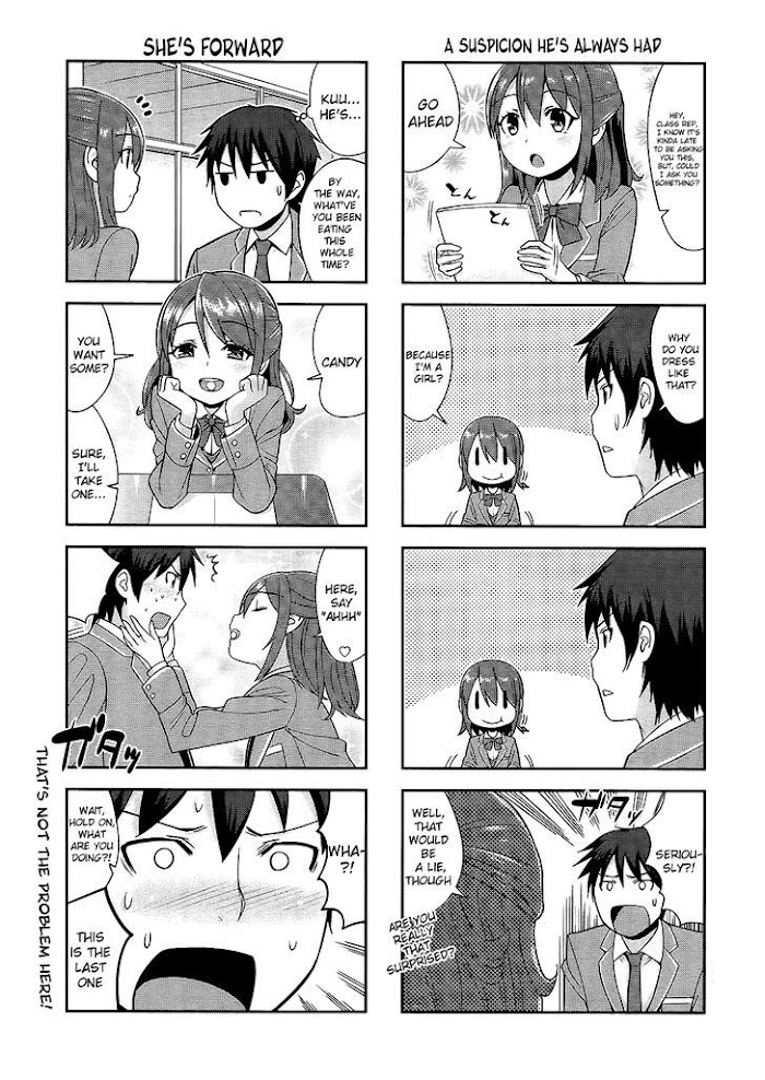 This series is titled "Class Rep Is a Boy in Drag," it is basically the crazy antics between the class rep and his straight man friend, and their back and forth interactions with one another as he attempts to seduce and he attempts to deflect. (Source: MU)