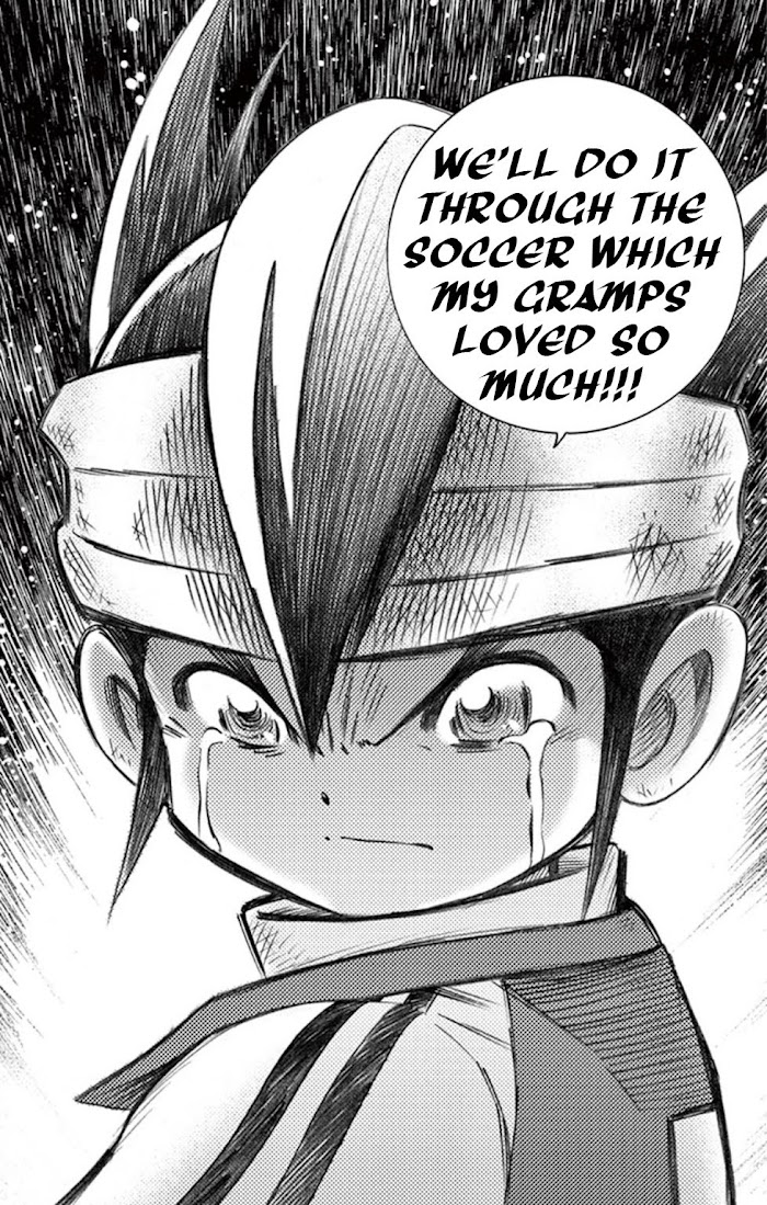 Raimon Middle School's soccer club captain, Endou Mamoru is in a pinch-his club is about to be destroyed! Literally! To avert the wrecking ball and disbanding of the club, his team must win against the toughest soccer team in the area-Teikoku. Will Endou and his team meet a crushing defeat or will a mysterious transfer student with a fiery kick save them from disaster?! (Source: MU)