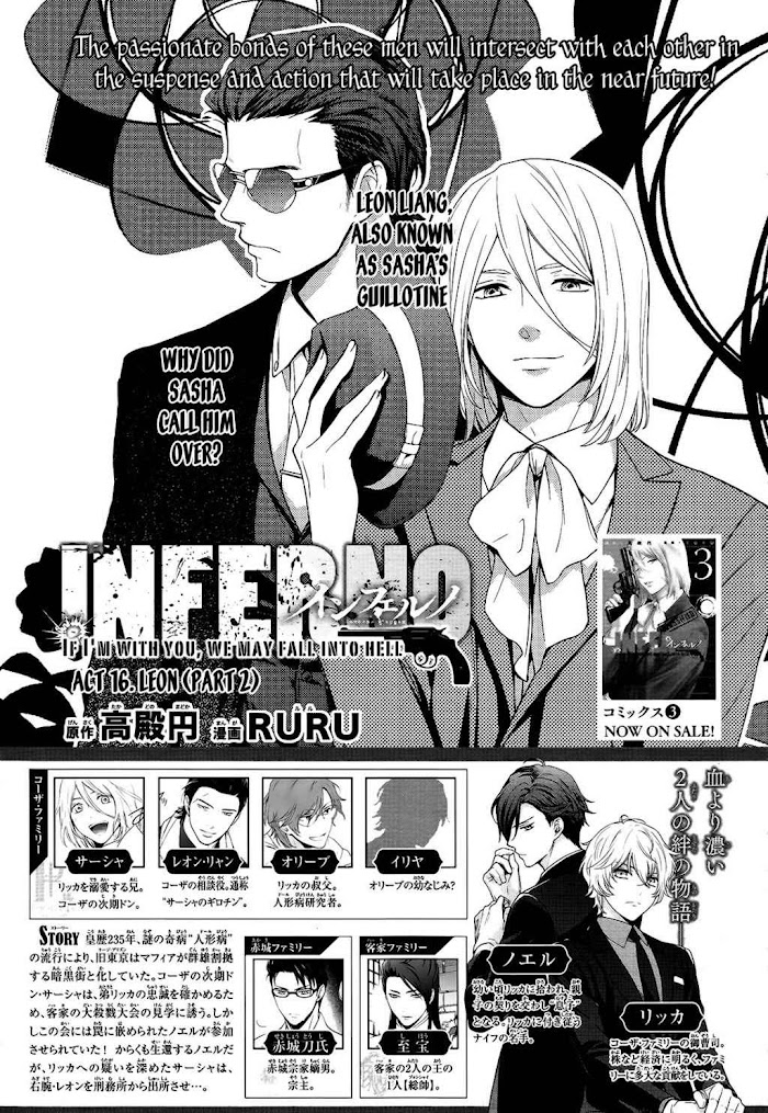Inferno (RURU) manga summary: From AQUA Scans: Japan, Year 2X65, Tokyo. As the population continues drop due to a mysterious disease, through a certain incident, the fates of two young men, the orphan Noel, and Rikka, the heir of a distinguished Mafia family, will cross... A thriller, depicting the tale of their Bond of Blood...
