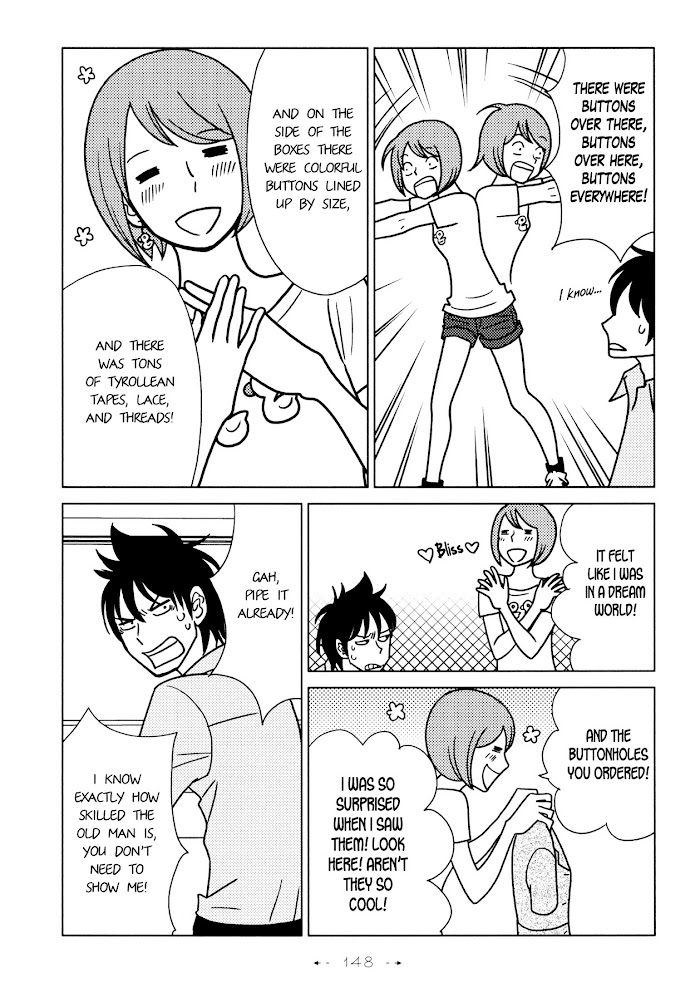 Awed by the beauty and elegance of a one-piece dress in a shop window, aimless university student Nanako Kuwabara leans against the glass to take a closer look at it. Just then, the plain-spoken shop owner Hirata steps out to tell her off for soiling the window he had just cleaned. The atmosphere of the shop and the owner's attitude are all in sharp contrast to the superior quality of the dress, but nothing deters the lovestruck Nanako from trying it on. When Hirata expertly alters it to fit her to perfection, she is over the moon, but she can hardly afford the price he names. Fortunately, she has no reason to worry, for Hirata offers to hire her as a part-timer in exchange for the dress. And what's more, this couldn't have happened at a better time: she is going to graduate soon with no job and no idea what she wants to do. Hirata repeatedly insists that she will be working at the tailoring shop only until she has paid for that dress, but it looks like Nanako might have plenty of reasons to stick around for much longer. [Written by MAL Rewrite]