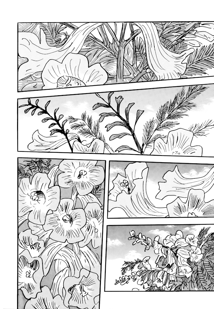 The shoot of an exotic tree appears in a Tokyo street. The popular affection turns into astonishment, then horror as the Jacaranda grows to colossal proportions, burning the capital to ashes in the course of a dantean night. Though, as sun rises survivors discover that it hasn't been a night of annihilation, but of rebirth. (Source: MU)