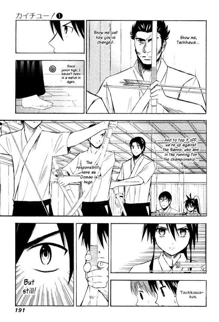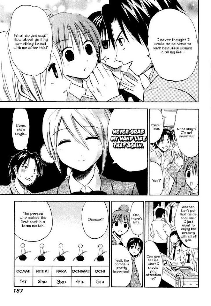 Tachikawa Tetsuya in an incoming freshman at a new high school and he's a great archer. He wants to join the archery club to meet the one they call "Kami no Ko", better known as Fudou Gonzaburou. Tachikawa is good, but he's heard that Fudou is even better. The archery team at this school is in fact very good. Tachikawa also meets a pretty girl who is already a member of the club (he accidentally walked in on her while she was changing). She's not very good from the look of things, but she is his senpai and he defers to her. She takes an immediate liking to him and kisses him after practice. Let's try just to get past the fact that this girl is actually a boy, named Fudou Gonzaburou… (Source: MU)