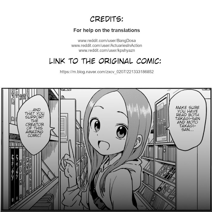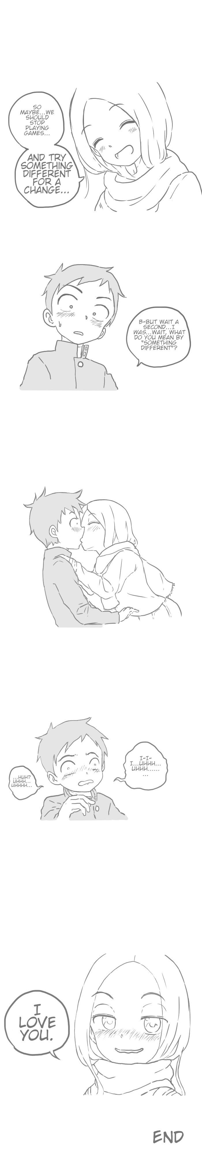 A scanlation of a fan-made doujinshi of Karakai Jouzu no Takagi-san. Original Desc: If you blush, you lose! Living by this principle, the middle schooler Nishikata gets constantly made fun of by his seat neighbor Takagi-san. With his pride shattered to pieces, he vows to turn the tables and get back at her some day. And so, he attempts to tease her day after day, only to find himself victim to Takagi-san's ridicule again sooner than later. Will he be able to make Takagi-san blush from embarrassment even once in the end?