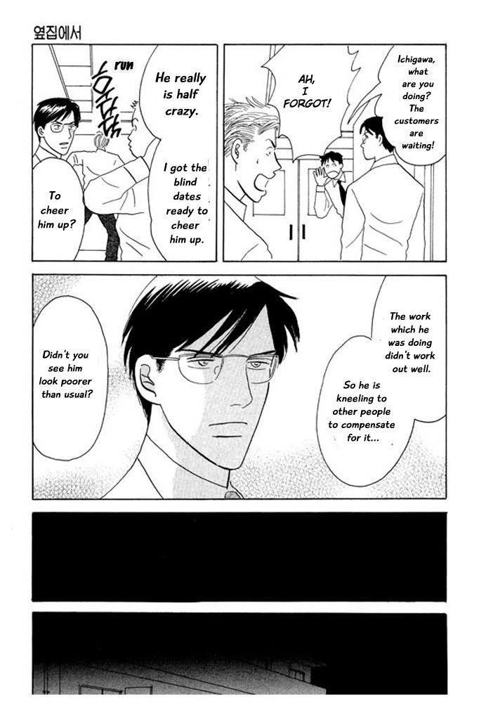 Main story: Not-so-prodigal son Natsuki, who's mother is a famous artist, comes home to get some cash (or something that he can sell), only to get caught and mistaken for a robber by a stranger in his own home. It turns out that the stranger is a student/assistant artist named Asou, that Natsuki's mother has allowed to lodge in their house. Asou seems like a polite, delicate flower and Natsuki enjoys picking on him. One night, Natsuki takes a trip to an infamous gay bar and sees Asou there. Asou was showing a different face there. At first, Natsuki thought it was a mistake. He goes back again and meets Asou face-to-face and finds out about his true and horrible personality. Tonari no Heya de: Serious Igarashi lives next door in his apartment to his friend/co-worker, Ichikawa. Ichikawa brings home a new woman almost every night and is nosy about Igarashi's habits. But overall, he is a very caring guy and gets along with everyone. Knowing Igarashi constantly buys his meals from convenient store, Ichikawa barges into his apartment and cooks for him. Its a nice friendship for the both of them. However, Ichikawa is unaware that Igarashi is gay. One night Igarashi meets with an ex-lover and takes him back to his apartment. After the guy leaves, unfortunately, Igarashi notices that Ichikawa came home early that day and finds out the truth about him. (Source: MU)