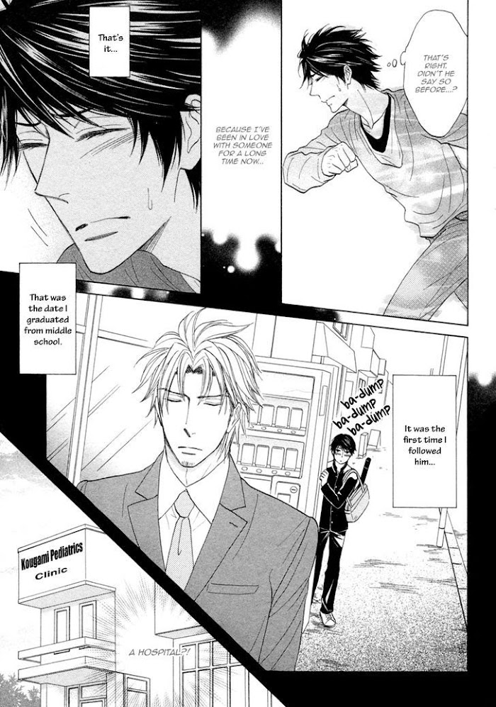 Ryou, who has always admired his deceased father's best friend and doctor, Kougami, decides to confess his love after he becomes a university student. But somehow that disastrous confession ends up in them dating?! A smooth sailing love story sinks into rocky waves since the only thing Kougami talks about is Ryou's father, Shun. (Source: Indigo Scanlations)