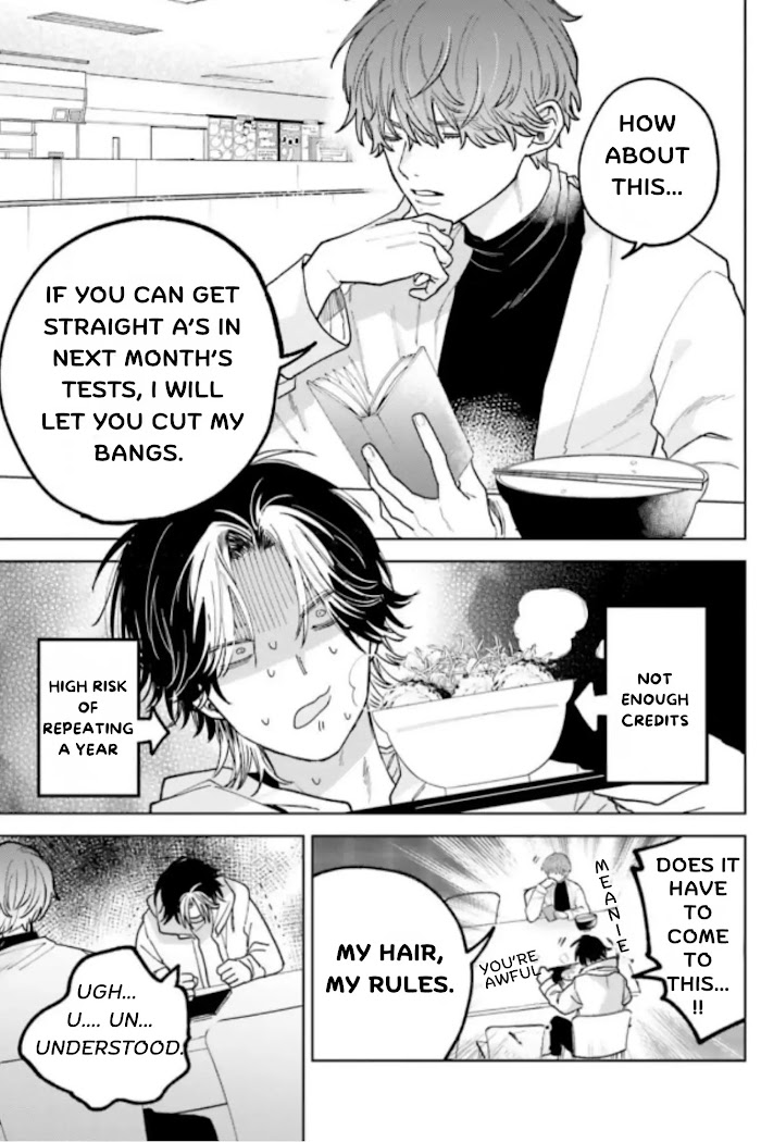 "Hey, let me cut your bangs." "Use honorific language, you little brat." University student Kishi is once again chasing his senior, Hanamoto, in an attempt to cut his bangs. The reason is, "If I cut his bangs, he'll be damn beautiful." No matter how many times Hanamoto rejects him, Kishi doesn't give up. A love story between a junior who is aggressively pursuing his beautiful senior!