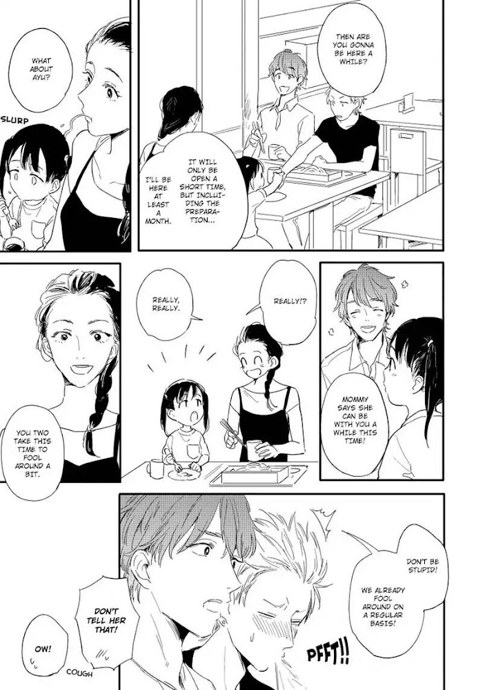 The kind, smitten Chiaki and the scary yet reliable Kazuma are a long-term gay couple. Tomoe, the tomboy who knows of their relationship, asks to see them, and they find her with a large tummy and another life growing inside her. The father is unknown, and although Chiaki and Kazuma are exasperated with the chipper Tomoe, they help her out. Before they know it, the baby is born. The two men are relieved that Tomoe is acting like a proper mother, but one day, Tomoe comes to them with tears in her eyes and says, "Take care of her for me.......!" (Source: Renta!)