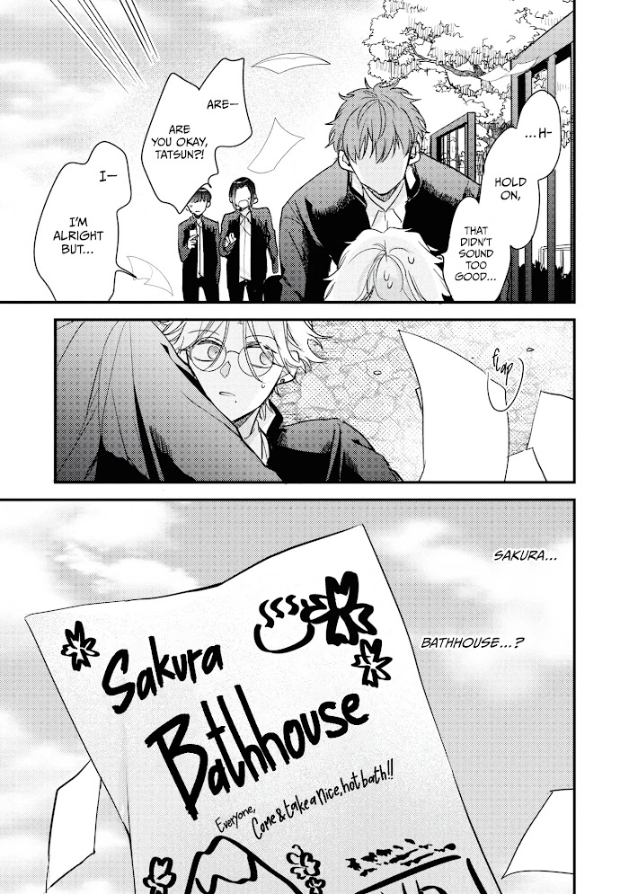 Description : Tatsumi Azuma, a third-year student at Keyaki High School, accidentally bumps into and fractures Shunpei Eguchi’s hand. Shunpei Eguchi is a second-year student at the same high school, rumoured to "kill anyone who makes eye contact with him." Out of fear of retaliation, Tatsumi pleads with Shunpei that he would do “anything”… Who knew that Tatsumi would end up helping out at Shunpei’s family-run Sakura Bathhouse?! Brought to you by Tsubaki Yuzu, the heart-warming story of a fierce, intimidating junior and a sociable, bespectacled senior!