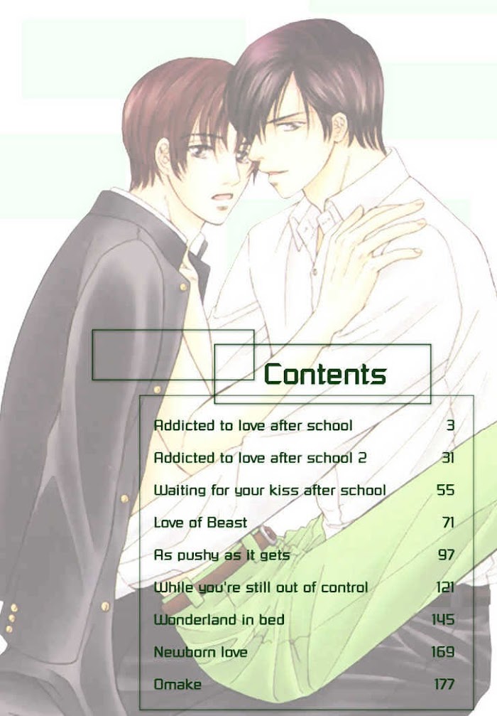 1) Addicted to Love After School When his student moves in next door a sensei begins to feel his work and personal life getting mixed up, especially when the paper thin walls let the sensei hear his student's solo nighttime activities. 2) Addicted to Love After School 2 One day, while alone in the student's apartment, the teacher finds a bag full of sex toys. Their relationshp becomes strained as the teacher keeps wondering when the student will be using them in their love-making. 3) Waiting for Your Kiss After School The drunken sensei accidentally injures his lover/student's private area and is forced into celibacy. 4) Beast of Love After his parent's death high school student Setsu is raised by his father's twin brother, Ryouichi. Even though Ryouichi is cold, Setsu can't help but cling to him. 5) As Pushy as It Gets Kazuki runs a convenience shop, and often has to ask his younger step-brother Ryouta to help out as a "pretend lover" for their female clients. Ryouta doesn't work for free however, and Kazuki must pay the price. 6) While You're Still Out of Uncontrol Ryouta is requested so often by lady clients he thinks nothing of it. But when a male customer wants to spend time with Kazuki, is Ryouta being cautious or unreasonably jealous? 7) Wonderland in Bed When Ryouta breaks an arm and leg Kazuki's work load doubles. Plus, Ryouta demands constant attention and care. Kazuki already spoils Ryouta, how much more can the sadistic younger brother want? 8) Newborn Love Kazuki plans a surprise birthday celebration for Ryouta, but why is this birthday so special? (Source: MU)