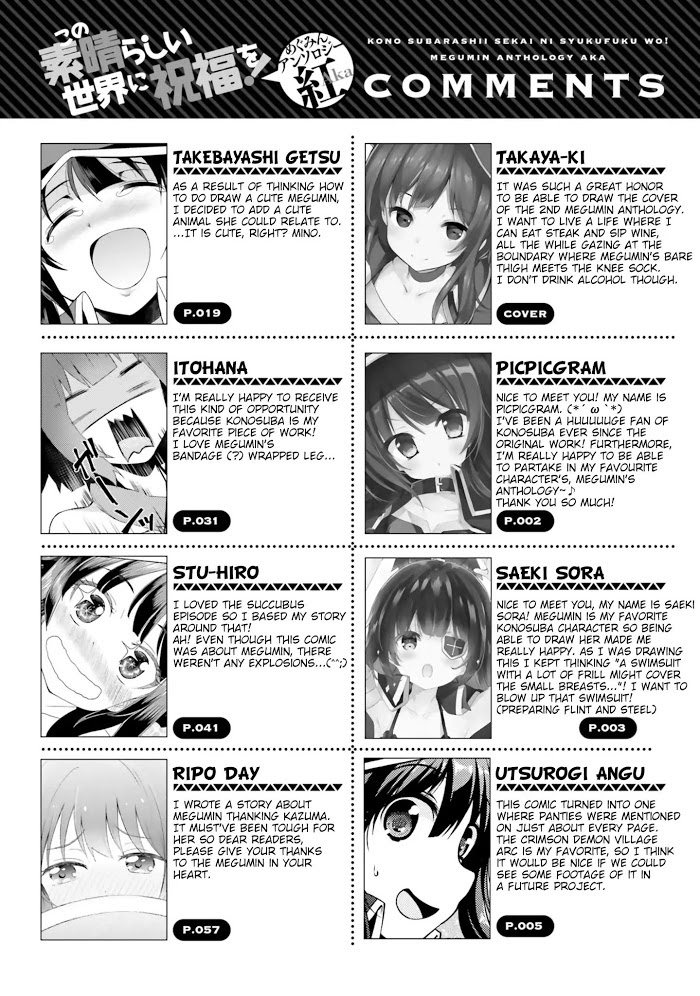 Kono Subarashii Sekai ni Shukufuku wo! Megumin Anthology Aka manga summary: The second 13-part anthology revolving around Konosuba's Megumin and her daily activities.