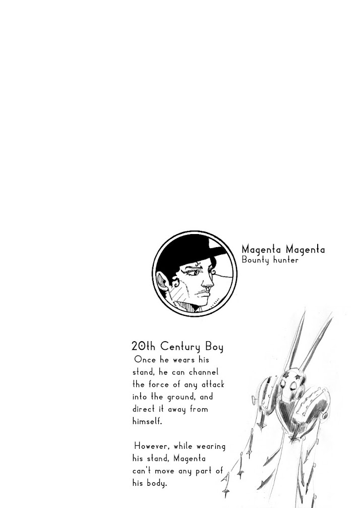 This is a fan made comic based on "Jojo's Bizarre Adventure Part 7: Steel Ball Run" It focuses around Magenta Magenta, and his earlier life before the appearence at the frozen strait. The presidental election is nearing it's conclusion, and Magenta has taken up a peculiar job from a federal agency. The pay is good, but something is off with the job, as Magenta has to track down an army deserter nicknamed Whatshisface, who is suspected of murder with a biological weapon. Nothing bad will come out of this, right?