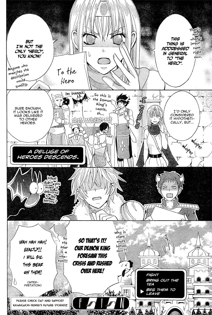 In a world where demons and humans are at war, there exists a Demon King, whose voice holds a power that destroys all in its way. When an unusual Hero attacks his castle, what's a Demon King to do other than confess his love? But thanks to meddling minions and the inconvenience of a voice that destroys everything in its path, his confession may not go according to plan... Included one-shot: Samishigari Brother