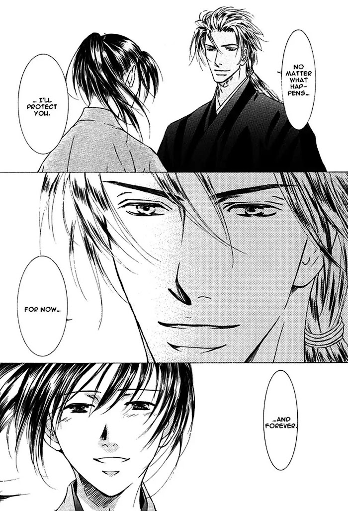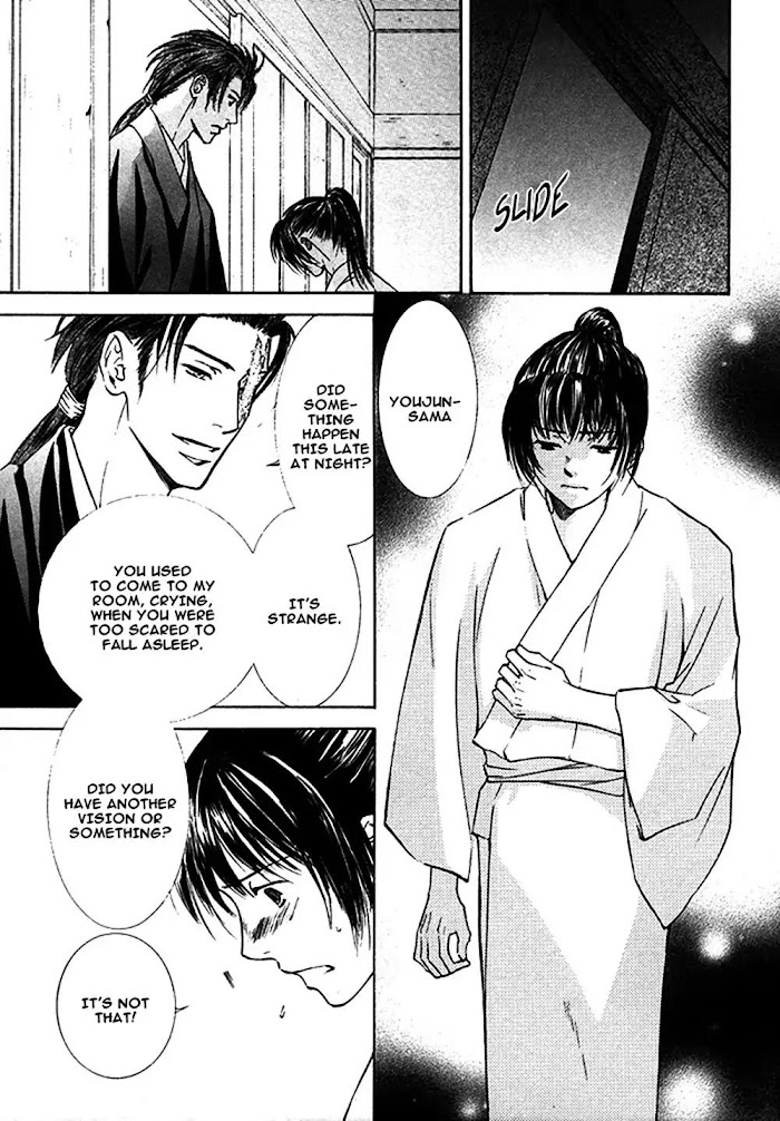 "It'd be nice if the last thing I were to see was a happy dream..." In feudal Japan, Youjun has the gift of foreseeing dreams, but for this reason he is going to be sent to Isurugi as a prisoner. And is it for this reason also that he asks for his close friend and bodyguard, Touichirou, to stay behind?