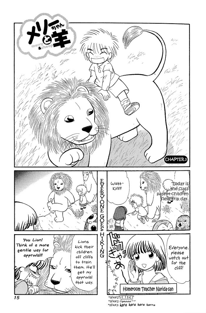 Merry & Sheep manga summary: From The Wafflehouse: Merry has been living with her uncle since her parents passed away. Only her uncle is a sheep! Meet Merry and her friends, Yuefa-chan (who has a panda Papa), Sukawara (who has a fish father) and Maiki (who has a lion father).
