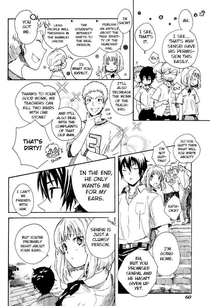 Kataoka (male) and Sato (female) have been friends since they were little. Kataoka has much better hearing than the average human, and he says Sato's voice is the most noisy of all. He has grown into a teenager able to hear everything from far around him-the good and bad. Now that the two of them are teenagers, Sato is affiliated with the school newspaper club, and Kataoka has mostly isolated himself. When the newspaper club decides to look into the truth behind some 'supernatural' rumors, Sato manages to convince Kataoka to lend the club his abilities. (Source: MangaHelpers)