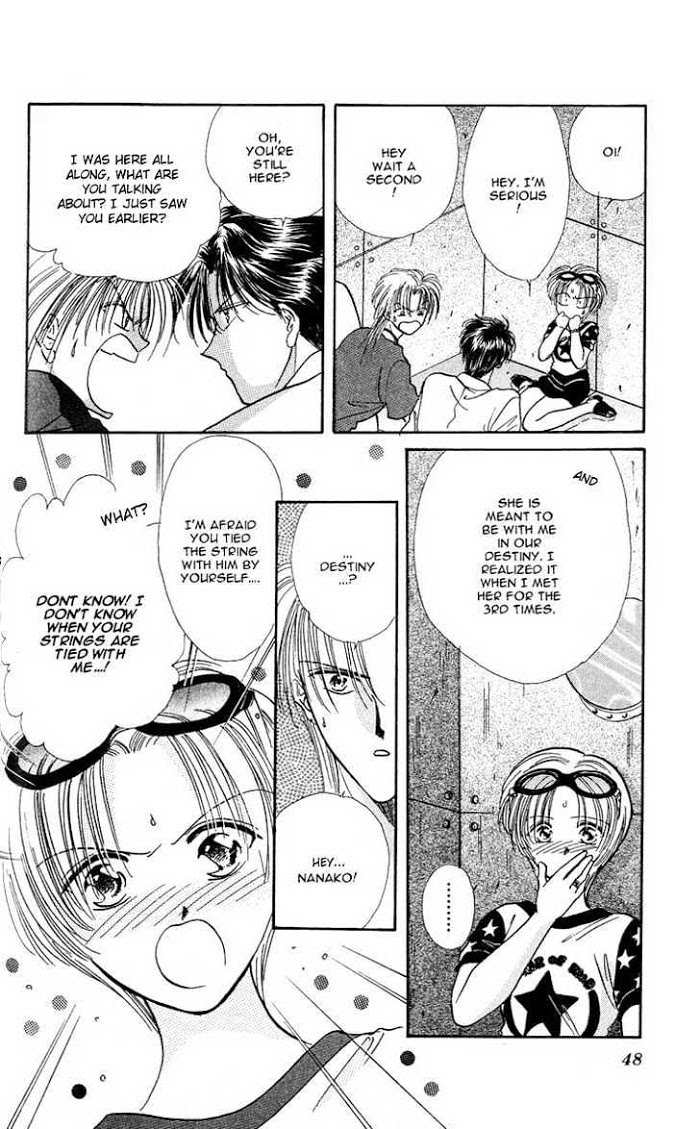 Volume 2 of the YuuTopia Collection. 1. Musubiya Nanako Nanako has her mother's ability to see the red strings that bind to people together in love. At her parents match making shrine, Nanako is forced to bring couples together by binding their strings. But who is she to be bound to? 2. Perfect Lovers Mitsuharu and Kana get into a car accident just after breaking up. They wake up just to find themselves in a dimension where homosexuality is normal and heterosexual relationships are illegal. 3. Memoir Girl Katakura Hitomi does not like her new step-mother taking up all the attention of her father. In an abandoned school building, she meets a high school boy who becomes her confidant. 4. Hang in There Nakago (Part II) Continues the tale from Mint de Kiss Me. (Source: MangaUpdates)