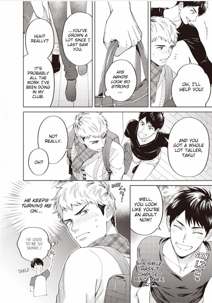 Three years after leaving his hometown to study in Tokyo, Taku comes home to see that his adorable younger childhood friend Keisuke has grown up to be a fine, fine man. What's worse, buff, tall Keisuke's become the exact kind of man Taku would love to have in bed! Taku knows he's gotta keep it all in if he wants to save their pure-hearted friendship, but how's he gonna do that when Keisuke's just seen one of his very special magazines