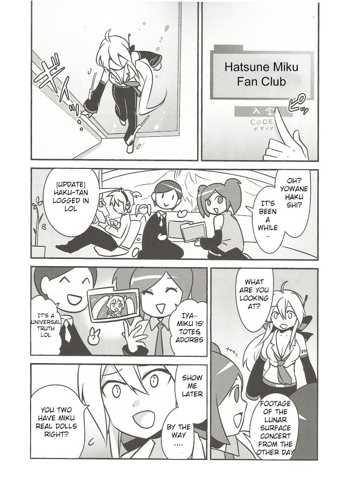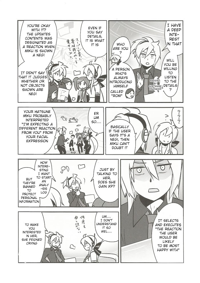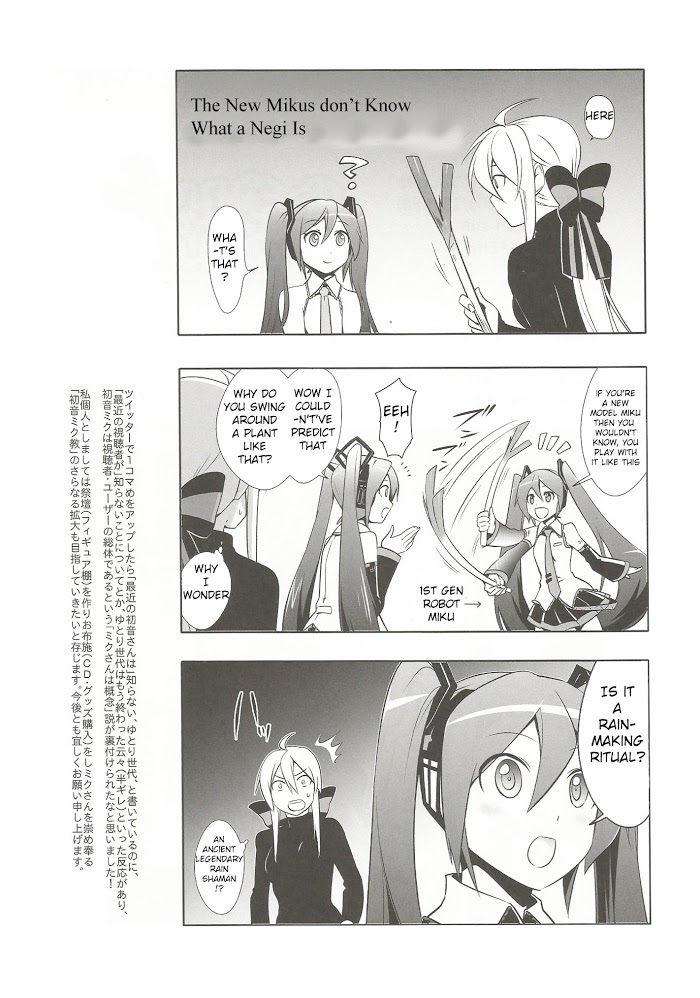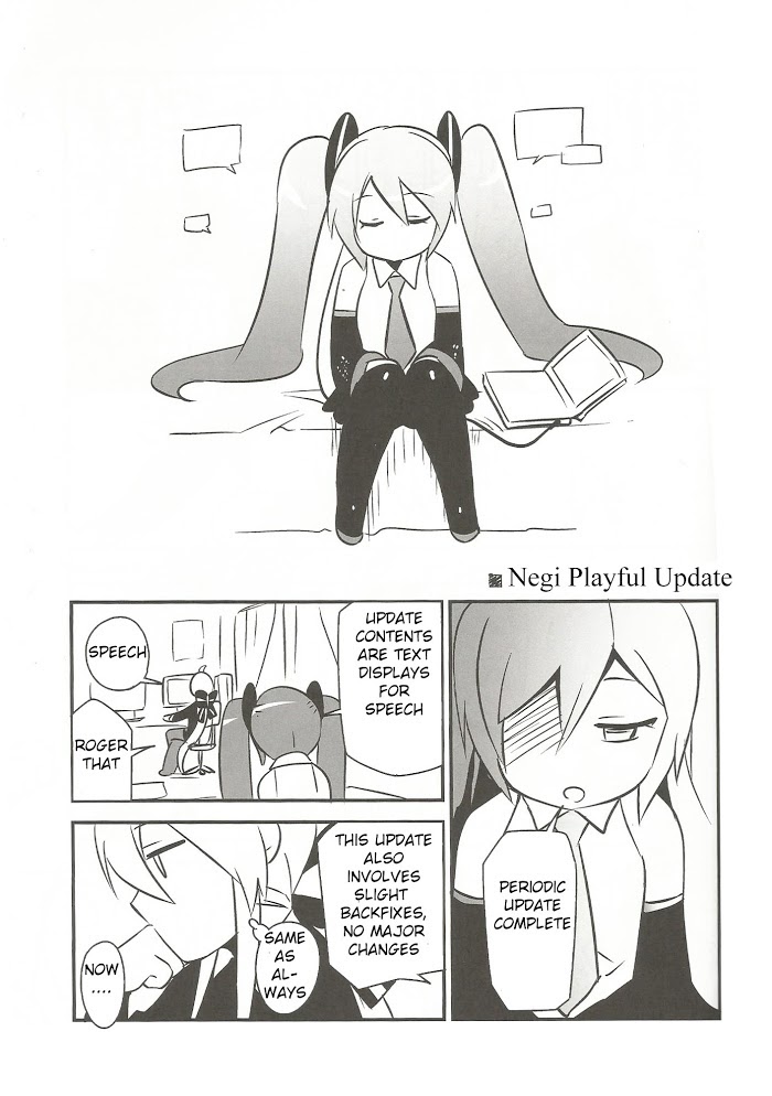 Negi Playful Miku manga summary: Hatsune Miku:Years ago was a masterpiece of musical synthesissoftware that was able to inspire people whenshe sang as a humanoid robot.She was only able to sing, dance a bit, and talk a bit.She's affordable for a humanoid robot but she's stillexpensive.Yowane Haku:At a consumer electronics shop, she fell in love with Mikuat first sight, and thought it would be a good idea to makemusic. But she wasn't able to make good music with Mikuand so Yowane Hapuked.A lifestyle living with Miku is difficult."Yowane Haku" is a handle name.