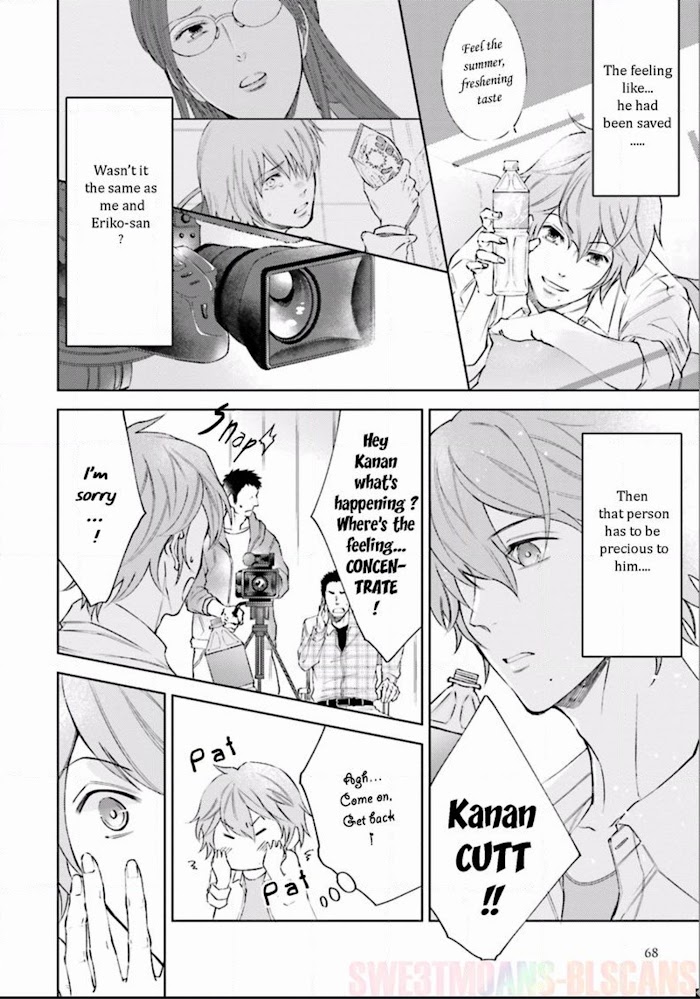 Ore wo Mamoru to Chikatteyo manga summary: "Heartthrob idol Shiina Canan accidentally helps Masaomi Mouze; a man who collapsed in front of him. Mouze in a rush of gratefulness, kneels down and requests to "Return his gratitude". When Mouze's manly body and back tattoo caught Canan's eye, he offers Mouze to live with him as his bodyguard to return the favour. A dutiful sense of gratitude X A bitch hidden behind a heartthrob facade." A dutiful sense of gratitude x A bitch hidden behind a heartthrob facade. This is a dramatic story about two people with perfect physical attraction.
