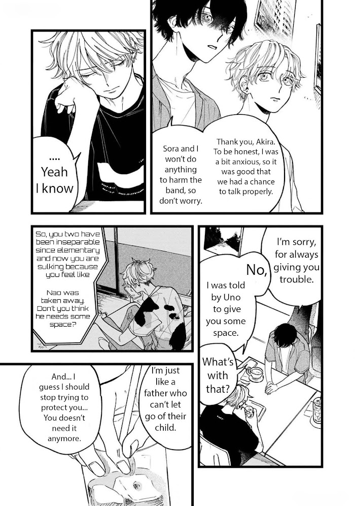 When his band breaks up and Sora is feeling lost, he happens to attend a concert where he reunites with Tamaki Naoharu, an upperclassman from his middle school. “I know that voice” -- a vivid memory from 10 years ago comes back to him. But there's a huge distance between Naoharu, shining in the light of the stage, and Sora, standing in the audience... The faint memory of his first love is reflected in these glittering lights. Sora and Nao's love story begins with a fated reunion.