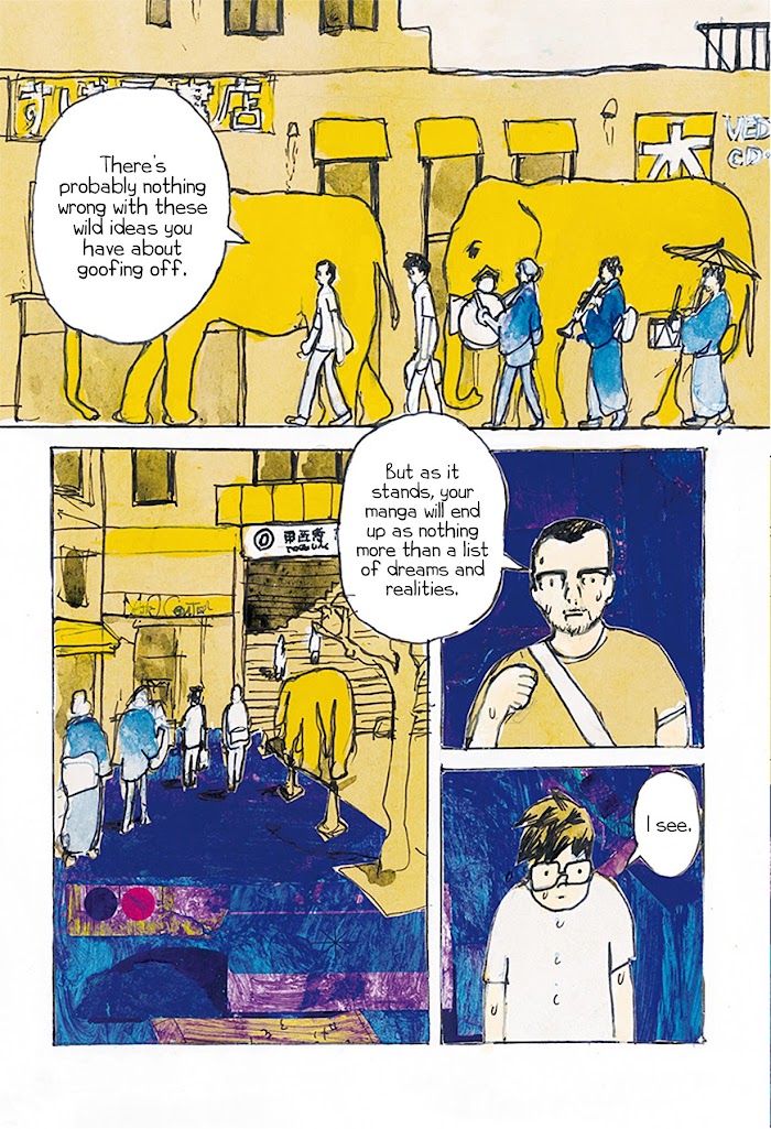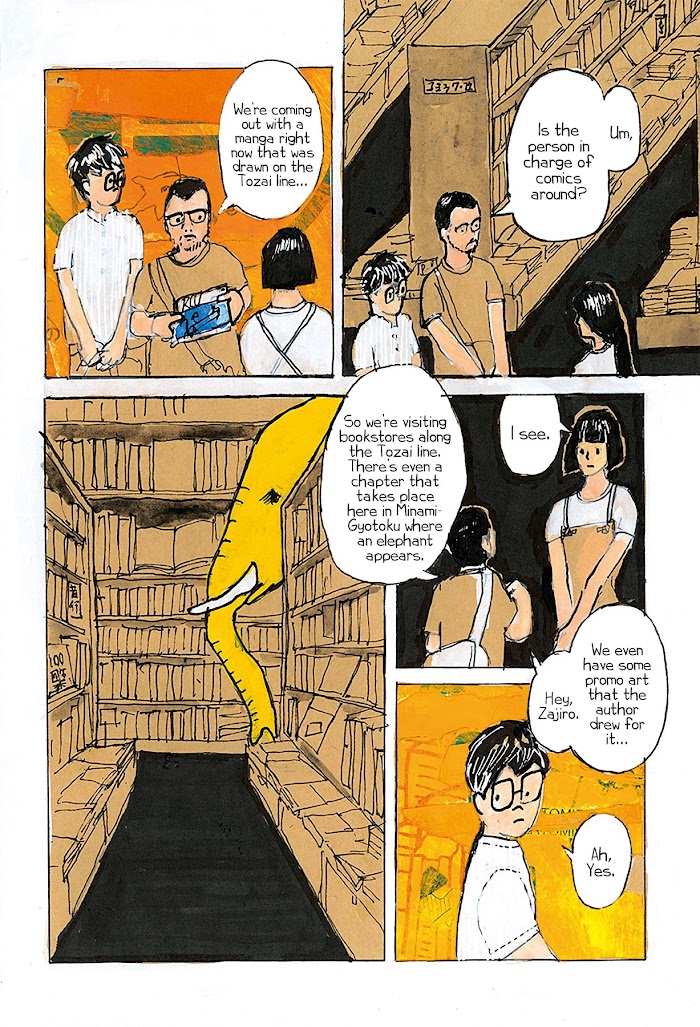 Zajirou is a salaryman who draws manga during his daily four-hour round-trip commute-a perfectly appropriate activity on a subway that shuttles between fantasy and reality. Today he continues to ride that real/surreal subway, pen in hand, depicting a mysterious underground world where pens take the form of pantographs and elephants amble aboard the train. (Source: Japan Media Arts Festival)