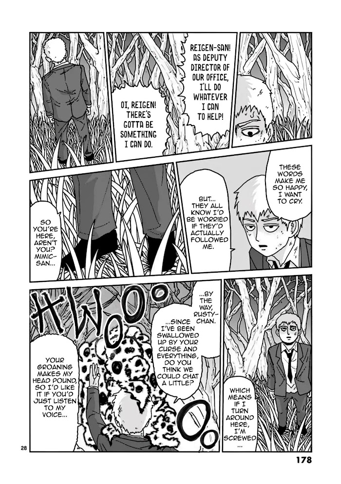 Reigen manga summary: Meet the self-proclaimed exorcist, spiritualist, and psychic himself. What he lacks in strength, he makes up for in charisma. What he lacks in bravery, he makes up for in ingenuity. What he lacks in heroism, he makes up for with massages and life advice. This is the story of Arataka Reigen and the Spirits and Such Consultation Office.