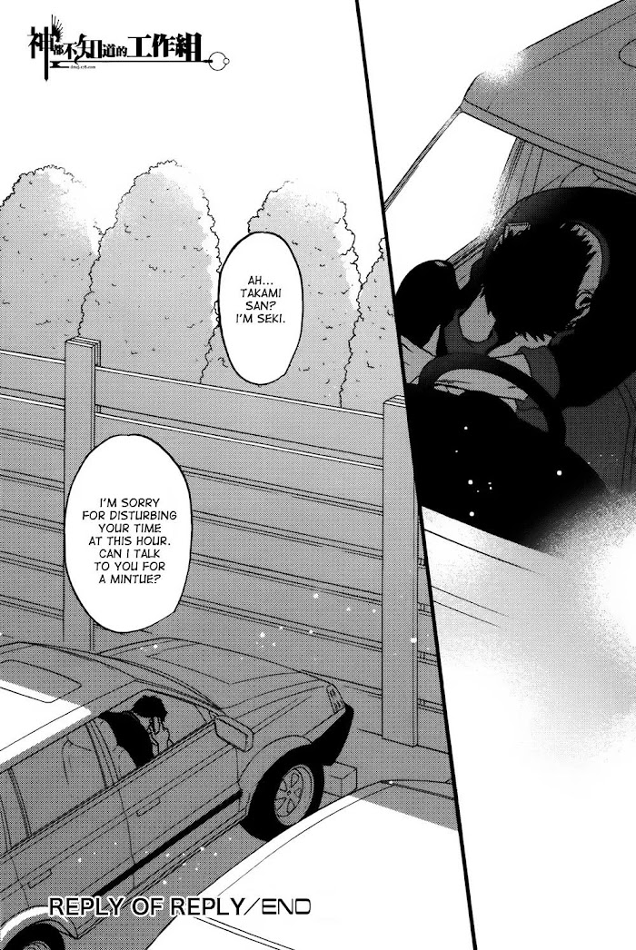 Reply manga summary: Seki is head mechanic at a car company in which Takami is the top salesman. After a chance encounter at work that involves Seki taking care of a spot of bother for one of Takami's clients, the two begin meeting regularly after work to dine together. Takami soon admits that he thinks of Seki as a good friend. Seki, however, knows that his own emotions are somewhat more complicated...