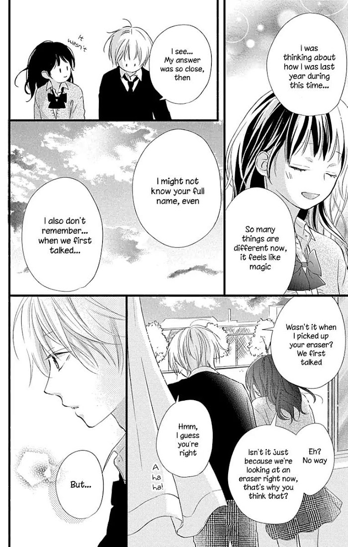 "You're far from my ideal type and we hardly have any common features. From now on too, we won't get involved with each other that much." That was what I thought, about what kind of person you were. (Source: MU)