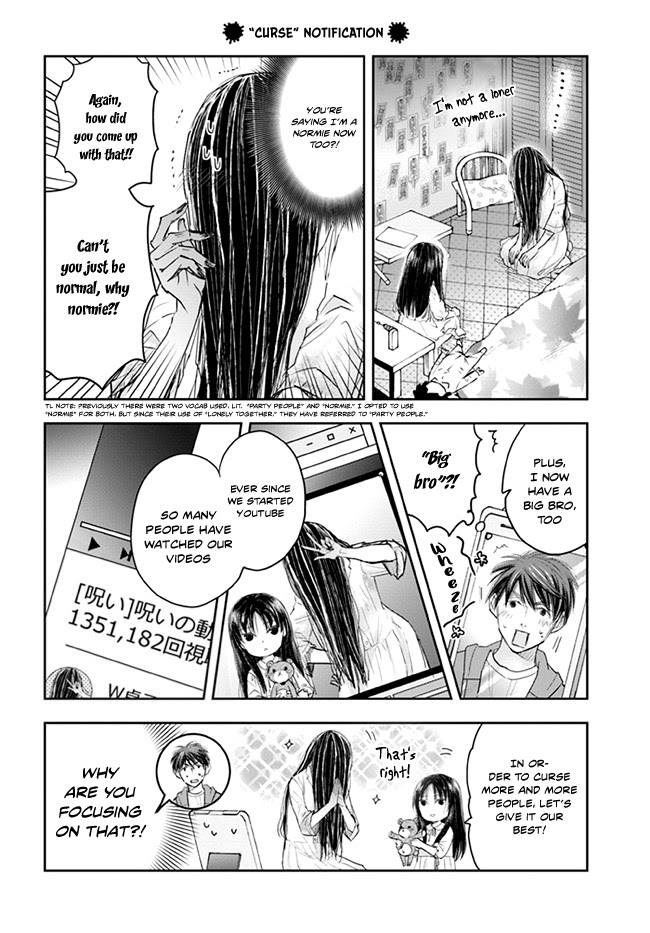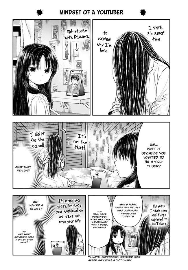 Sadako-san and Sadako-chan manga summary: The story follows a young girl named Sadako who spends every day in a narrow closet until one day the ghostly Sadako comes to curse and kill her. The ghost is surprised that the young girl doesn't fear her, but instead looks forward to visiting with the apparition. Instead of cursing her, Sadako and little Sadako decide to debut as content creators and make videos together. Readers can catch a glimpse of Sadako's true face when the young girl fixes up the ghost's hair.