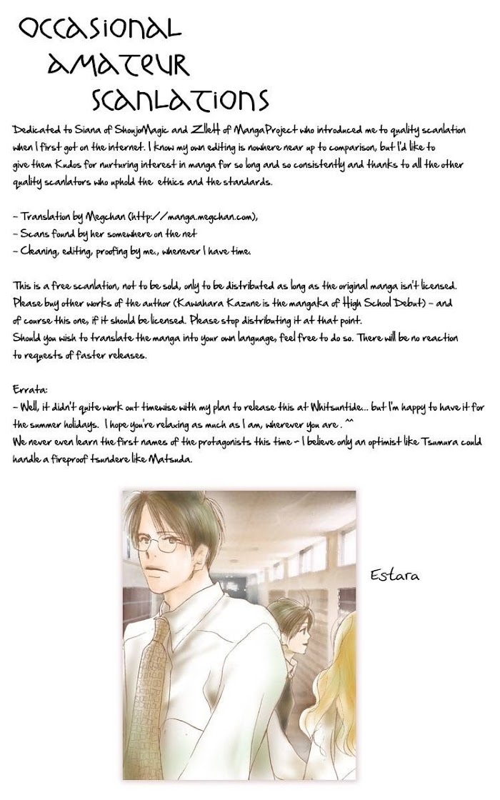 A collection of one-shots by manga-ka Kawahara Kazune. Shiawase no Kanzume: Emi has been dating Fujii-kun for a month now, but their relationship seems no different than when they were still acquaintances. Depressed that it's still a one-sided love, one day, she gets a prize called "Canned Happiness" from her local town's raffle. Unsure of what it is, she accepts it, but soon forgets about it until suddenly, a small man with a white beard appears in front of her... Otoko no Ko ni wa Wakarumai: Hasegawa Shinako has always been worried about her weight. When she secretly finds out that she weighs more than the guy she likes, she vows to go on a diet. Embarrassingly, he finds out and...?? Million Words: Kitou is dating Kawai, a guy one grade below hers. Although things are going well enough, she still can't help feeling like the relationship will not last. They each have their separate worlds and Kawai will probably notice this soon... Kawaisa Amatte: Matsuda has always had a problem saying what she truly thinks in front of people. Once she gets nervous, she seems only able to say the exact opposite words she means to say, especially in front of Tsumura, the guy she likes. At this rate, he will abhor her in a matter of days... Itsumo Watashi ga Koko ni Iru: Kawamura asked Tanaka out as a favor to Kondou-senpai. The plan was that Tanaka would refuse, Kawamura would push harder, and Kondou would heroically come to Tanaka's rescue. The plan was NOT for Tanaka to say yes...