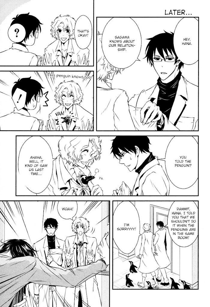 Shiina is a serious man who has wanted to be a zoology professor since he was a child. He was infamous forcarrying around many massive books and now Shiina works diligently to train future zoologists at a university while looking after his childhood friend, Chitose. Chitose is also an associate professor of biology and walks around everywhere with penguins, making him quite infamous as well. This manga focuses on the trials, tribulations, and future of the young associate professor, Shiina. (Source: the manga habit) Included one-shot: Volume 4: Bijutsu-kei Danshi