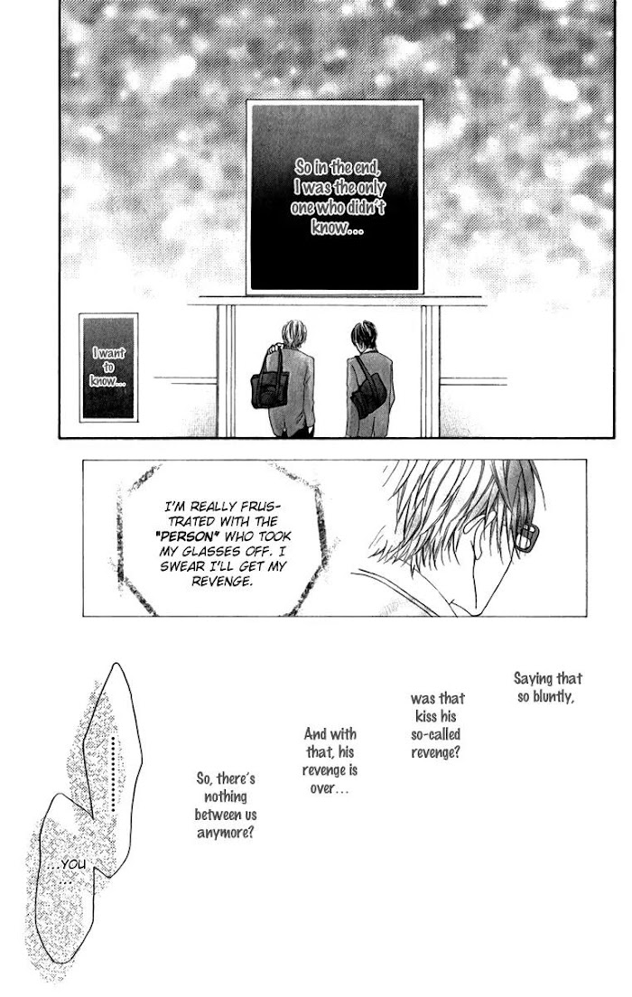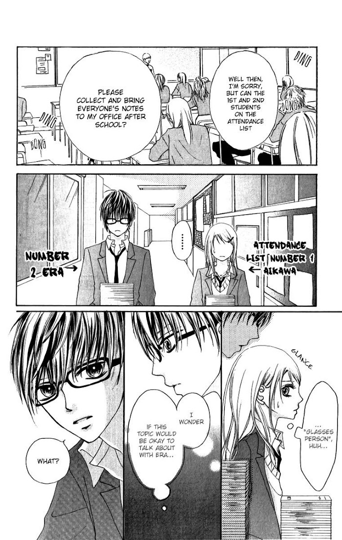 Love at first sight means bad luck for her so Koyori can't find real love. The same thing can't happen again!! ...she decided but just when she did so, she meets Mine during summer classs and falls in love at first sight again!? But Mine is different from the guys up until now, he's pure and straight forward and Koyori's heart can't stop loving him!? (Source: Evil Flowers) Included one-shots: Sono Megane, Hazusu Bekarazu.; Mousou suru Kuchibiru