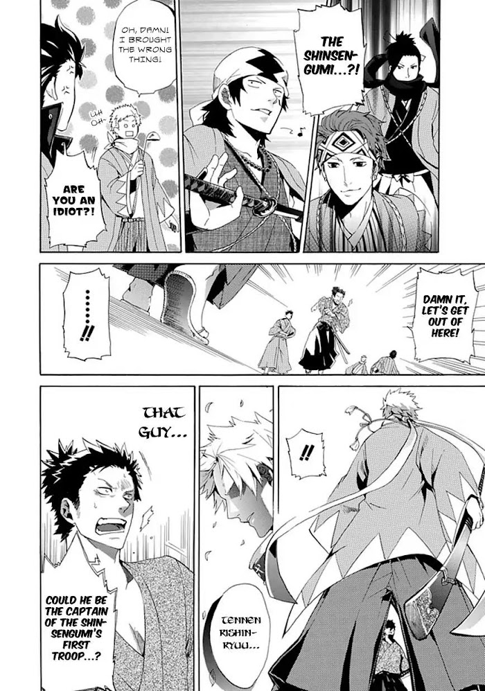The captain of Shinsengumi's first troop has not been performing well. It's making his comrades worry, and they assume that his "condition" was because of love. Does love make one weaker? Or otherwise?