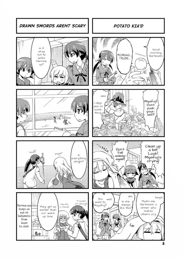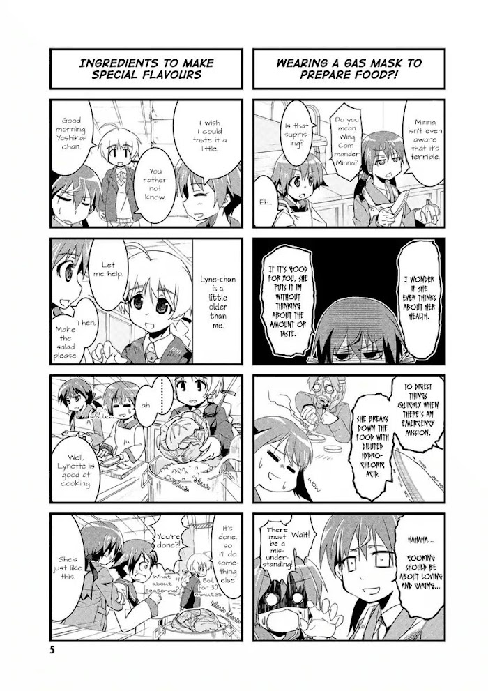 Strike Witches: 501st Joint Fighter Wing Take Off! manga summary: Yoshika Miyafuji joins the 501st Joint Fighter Wing, a defense unit specializing in taking down alien beings known as the Neuroi. However, in days of no invasion, she and the members of the unit are taking down day to day tasks like cooking and laundry.